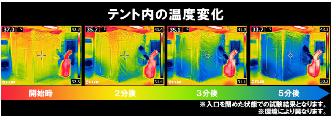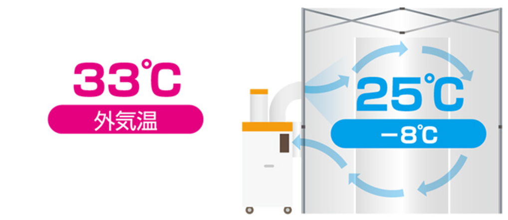 スポットエアコンは外気を取り込み冷やした空気を発生させますが、クーラーテントはスポットエアコンで冷やした空気を循環させる事で素早いテント内の冷却を実現します!